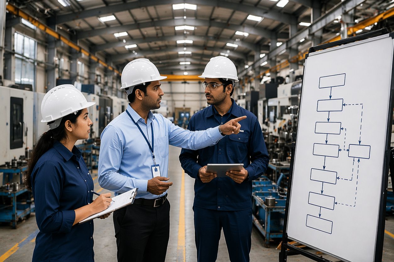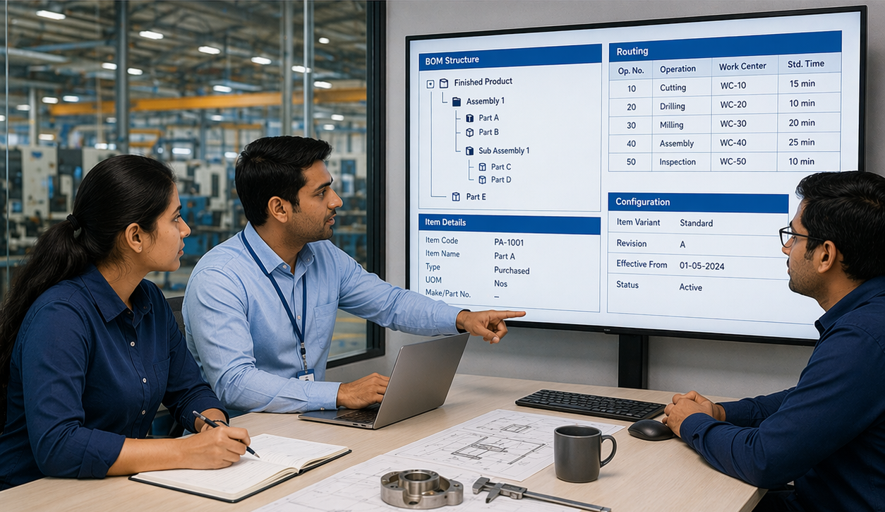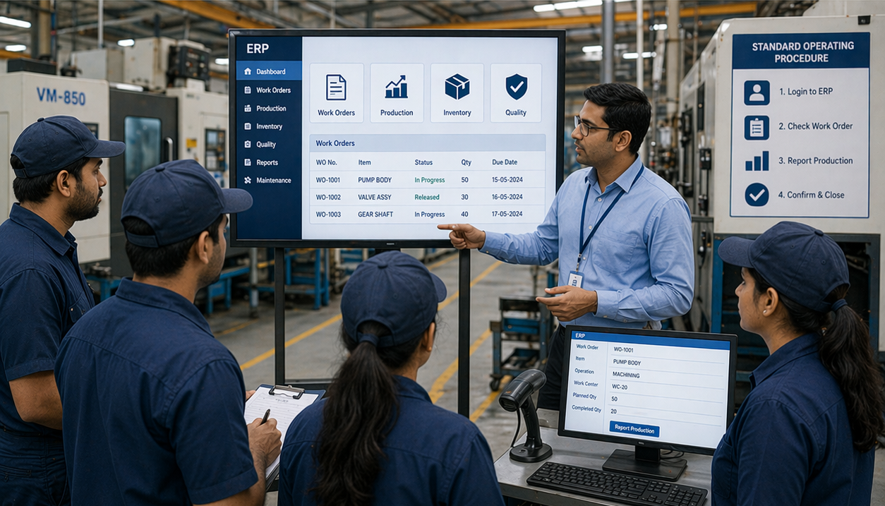 Role-based training for site engineers (material tracking, attendance), procurement teams (PO workflows, three-way matching), sales teams (CRM, booking, payment tracking), accounts teams (project accounting, GST, TDS), and management (dashboards and reporting).